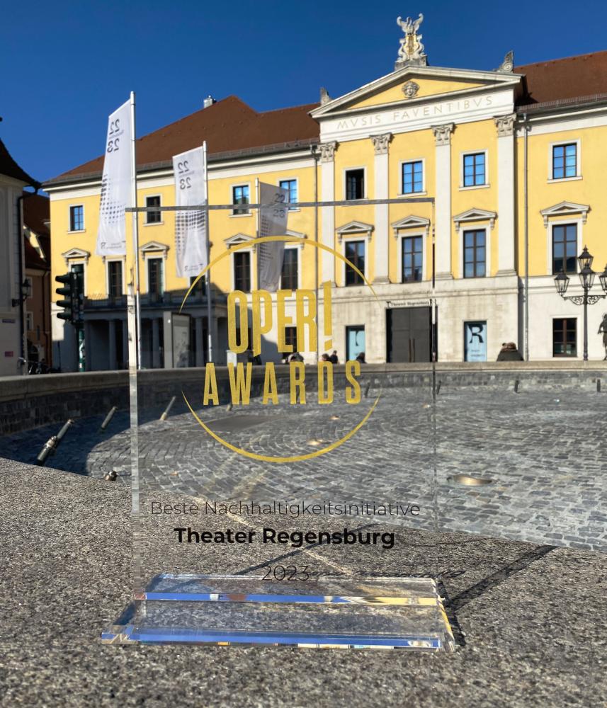 Hurra! Wir haben einen OPER! AWARD 2023 gewonnen. Die Preisverleihung ist ein Branchentreffen insbesondere der großen Opernhäuser im deutschsprachigen Raum – deshalb sind wir besonders stolz, dass unsere Bemühungen um ökologische Nachhaltigkeit abseits der großen Zentren überregionale Resonanz gefunden hat. Gemeinsam mit dem Musiktheater im Revier Gelsenkirchen wurden wir als „Beste Nachhaltigkeitsinitiative“ ausgezeichnet. Aus der Jurybegründung: „Bitte dranbleiben, nachmachen und, wie Gelsenkirchen und Regensburg, valides Datenmaterial erstellen! Denn das ist noch immer die beste Grundlage für die richtigen, nachhaltigen Entscheidungen.“