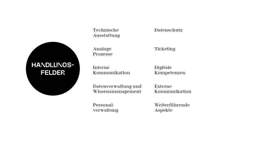 Insgesamt konnten wir durch den Analyseprozess zehn Handlungsfelder identifizieren, durch welche sich die etablierten Strukturen und Arbeitsweisen, aber auch Herausforderungen und Wünsche hinsichtlich der digitalen Transformation des Theaters strukturieren ließen. Dabei haben wir schnell bemerkt, wie zentral der Entwicklungsbedarf der digitalen Infrastruktur tatsächlich war und wie weitreichend damit verwobene Aspekte sind.