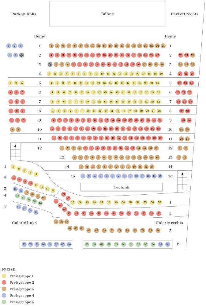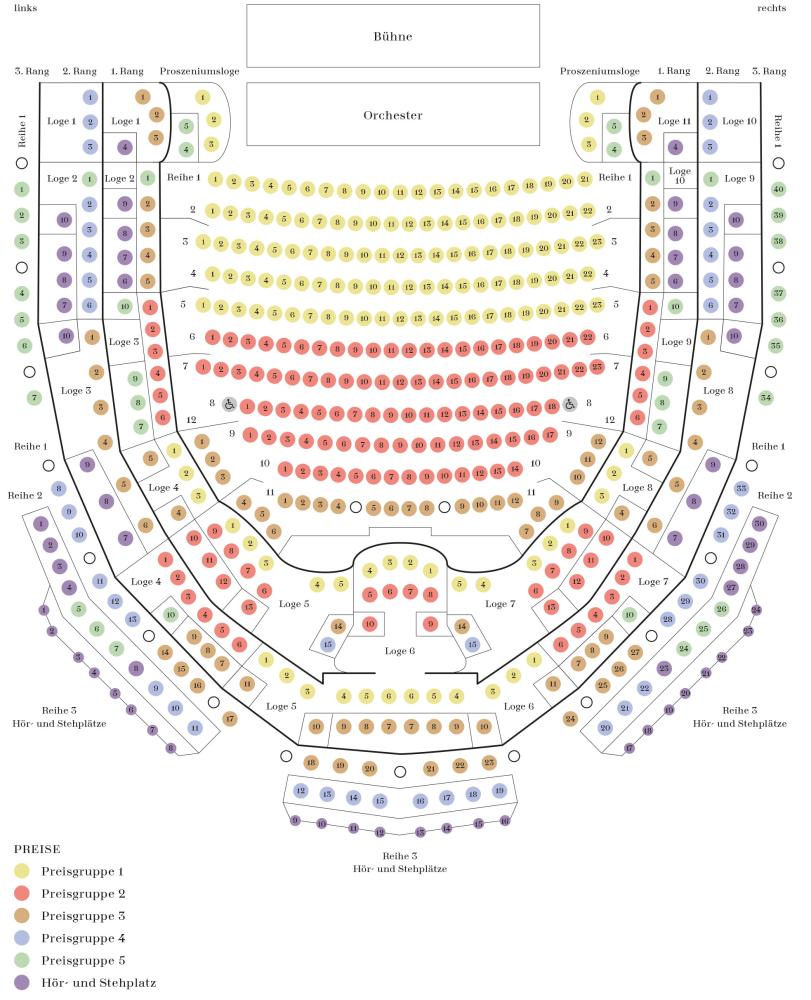 | Preisgruppe | PG I | PG II | PG III | PG IV | PG V | Hör-/Stehplatz |